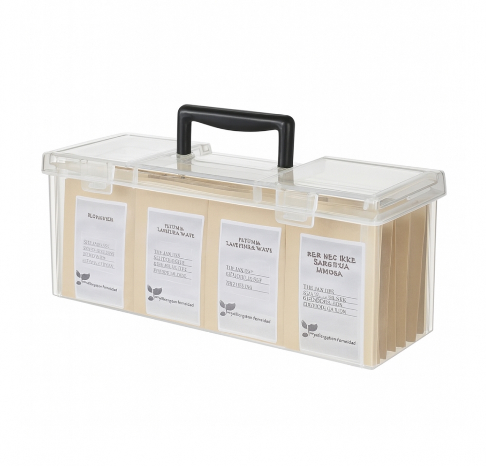Superkjekk boks til oppbevaring av frø med håndtak.