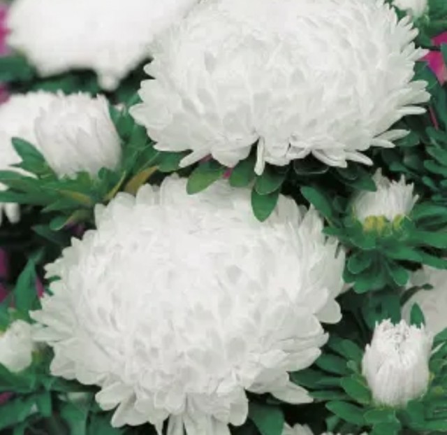 Callistephus chinensis. En elegant og renhvit asters med store vakre blomster. Perfekt å mikse med andre farger. Med sine lange sterke stengler passer de utmerket som snittblomster. Høyde 50-80cm