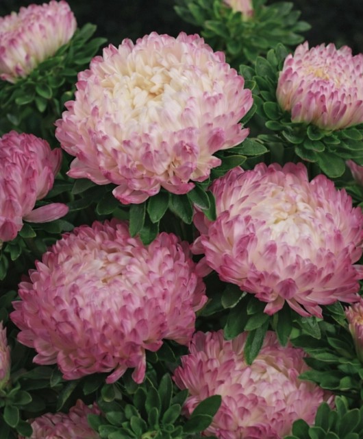 Callistephus chinensis. Store, kremhvite blomster med rosa kronbladspisser. Ekstra doble peonblomster på solide stilker. Utmerket til både blomsterbed og snittblomster.
