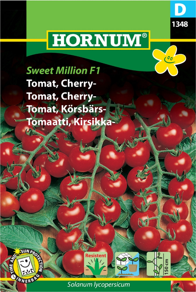Solanum lycopersicum. Her får du lange klaser med store, røde cherrytomater på friske og voksevillige planter. God, mild smak med mye sødme uten for mye syre. skal tyves.