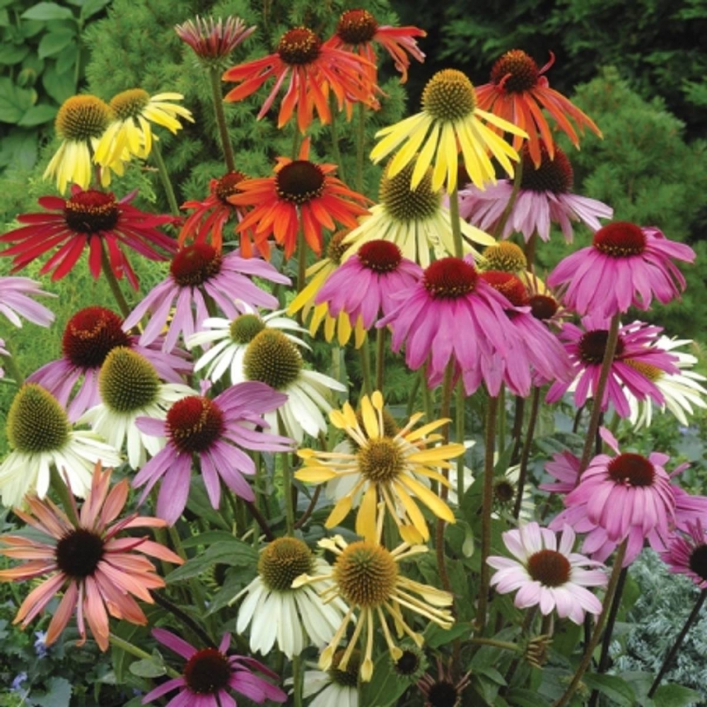 Echinacea purpurea. Flerårling. Blandede solhatter i uventede fargekombinasjoner, fra hvitt, gult og rosa til neonrøde nyanser. Også plantehøyden varierer etter hvert med lang, uavbrutt blomstring. Til blomsterbed og samplantinger.